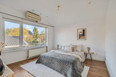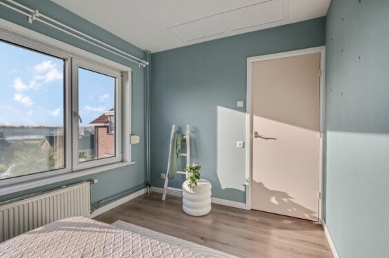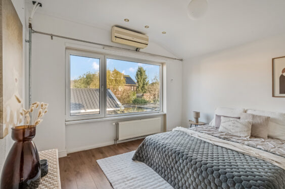 1e Verdieping: overloop met toegang tot de 3 slaapkamers, waarvan de ouderslaapkamer een prachtig uitzicht heeft over de rivier de Rijn. De slaapkamer aan de tuinzijde is voorzien van airco. De 3e slaapkamer beschikt over een een kast waarin tevens de CV-opstelling is weggewerkt. De geheel betegelde badkamer beschikt over een inloopdouche voorzien van thermostaatkraan, wastafel met spiegelkast en designradiator.