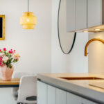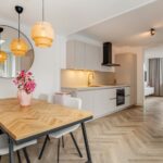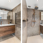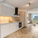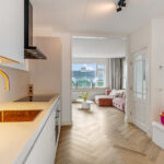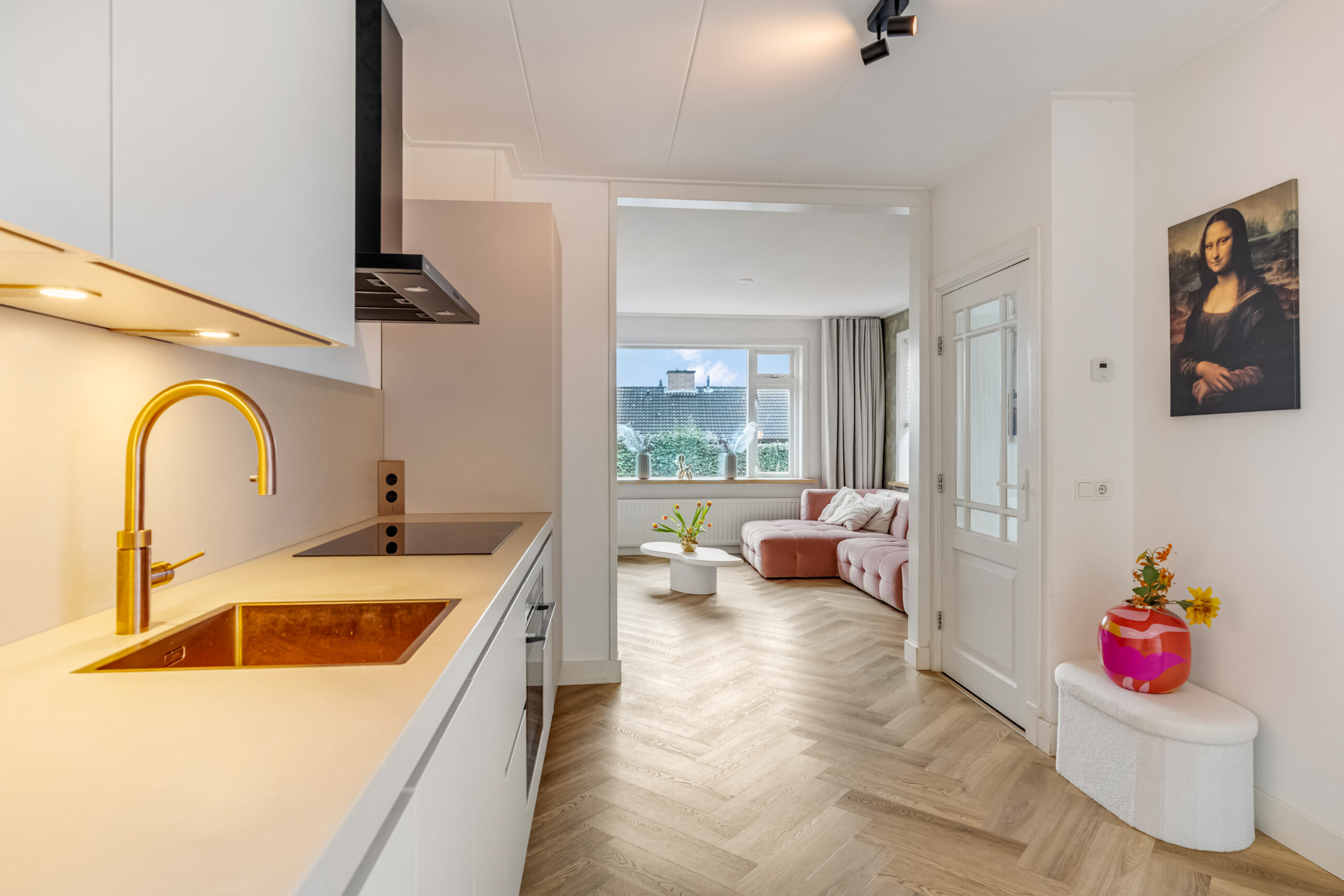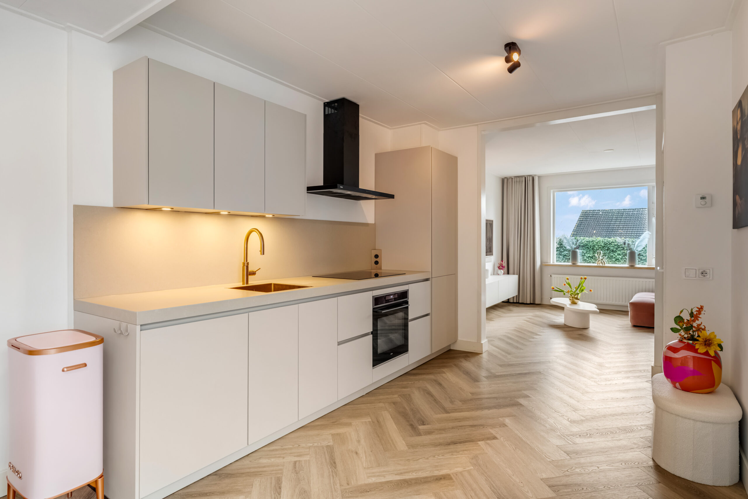 De moderne keuken vormt het hart van de woonkamer en is uitgevoerd met bovenkasten, een stenen werkblad en diverse inbouwapparatuur, waaronder een inductiekookplaat, afzuigkap, koelkast en oven. Vanuit het eetgedeelte bereik je een tweede hal met een moderne toiletruimte, garderobe en toegang tot de tuin. Aansluitend vind je de bijkeuken met werkblad en netjes weggewerkte aansluitingen voor was- en droogapparatuur.
