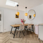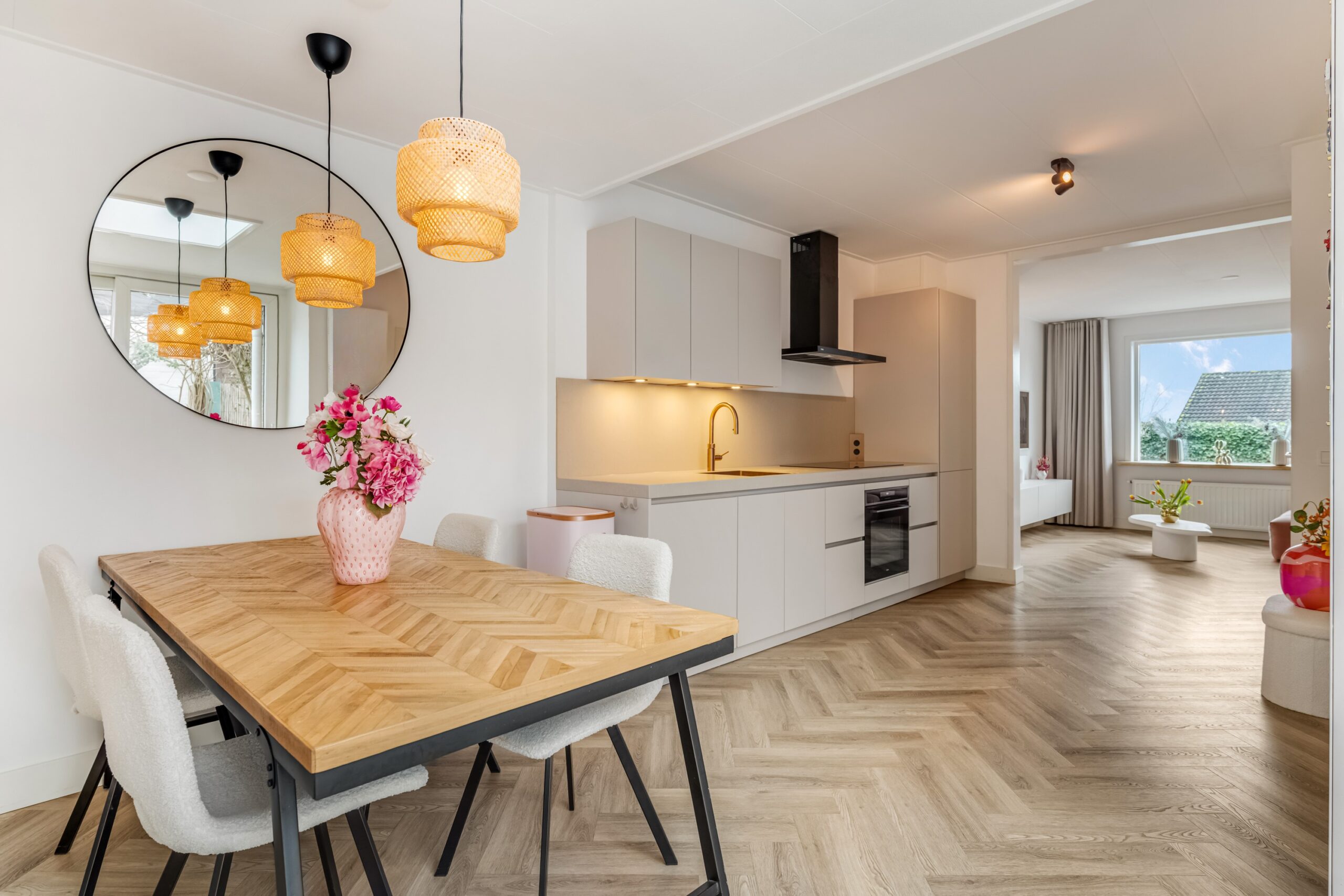 Begane grond: Je komt binnen in de hal met trapopgang naar de eerste verdieping. De straatgerichte woonkamer ademt sfeer dankzij de schouw met gashaard en de fraaie PVC-vloer. Het zitgedeelte loopt mooi over in het eetgedeelte aan de achterzijde, waar een schuifpui zorgt voor direct contact met de patioachtige tuin. Extra prettig is het licht van de lichtkoepels, waardoor de ruimte open en aangenaam aanvoelt.
