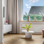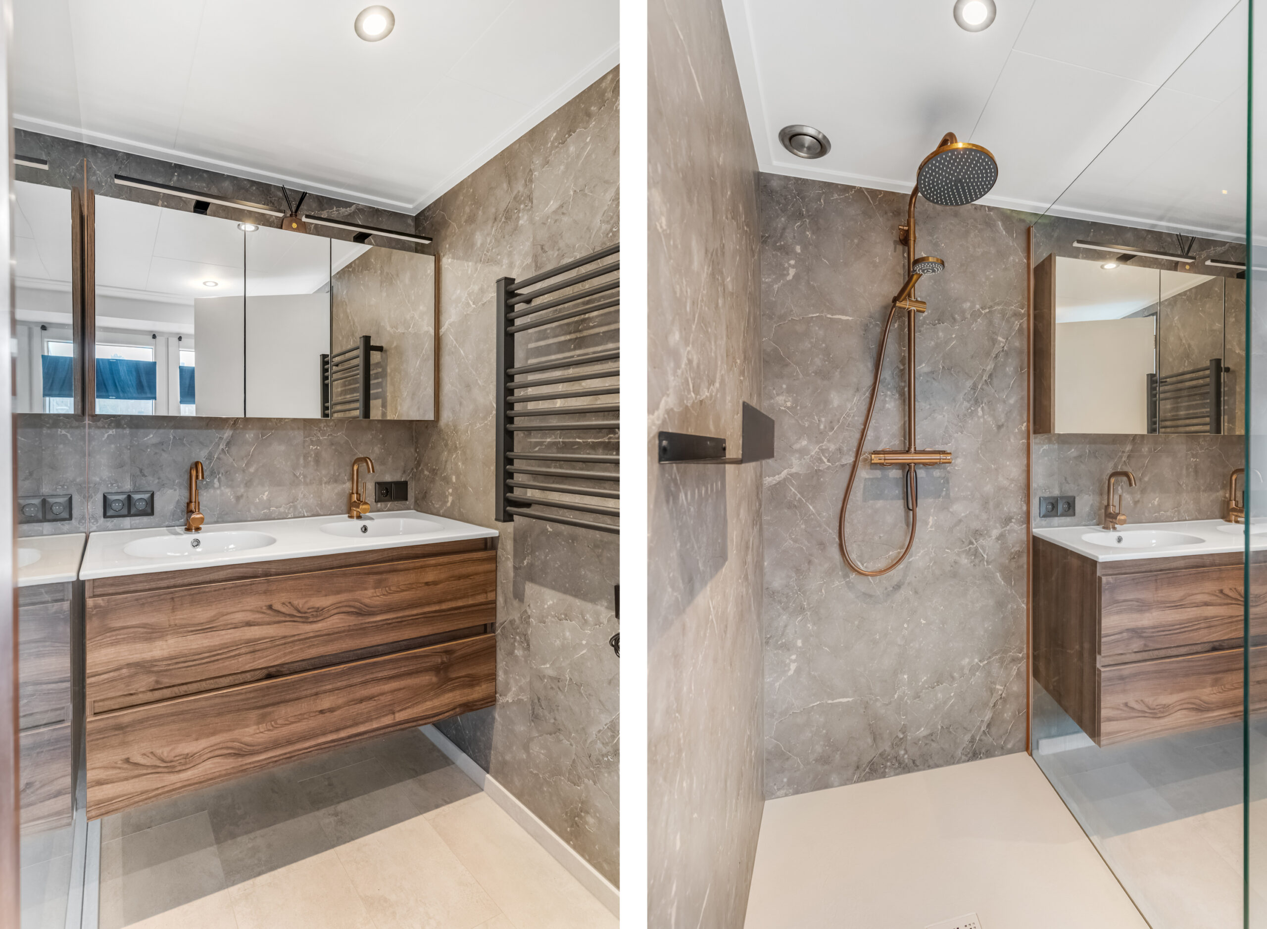 Eerste verdieping: Op de eerste verdieping zijn twee slaapkamers gesitueerd aan de voorzijde. De hoofdslaapkamer trakteert je iedere dag op een prachtig uitzicht over de Rijn. De tweede kamer beschikt over een dakraam en is perfect als kinder-, logeer- of werkkamer. De moderne badkamer is stijlvol afgewerkt en voorzien van een dubbele wastafel met spiegelkast, een ruime inloopdouche met thermostaatkraan en een designradiator.