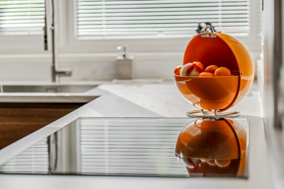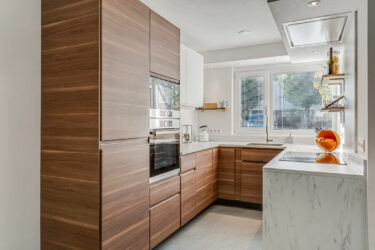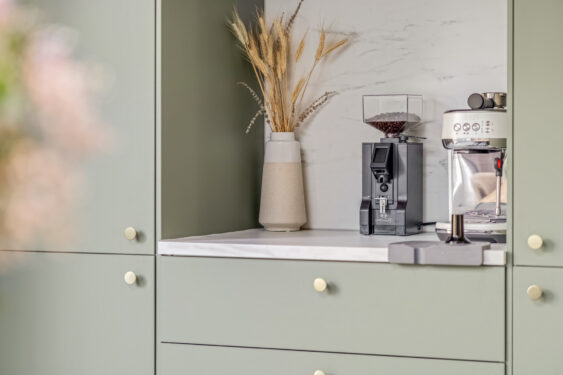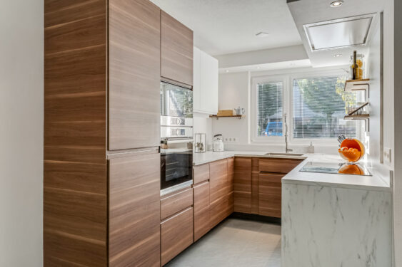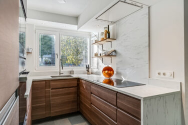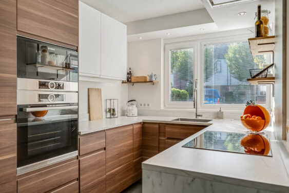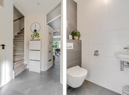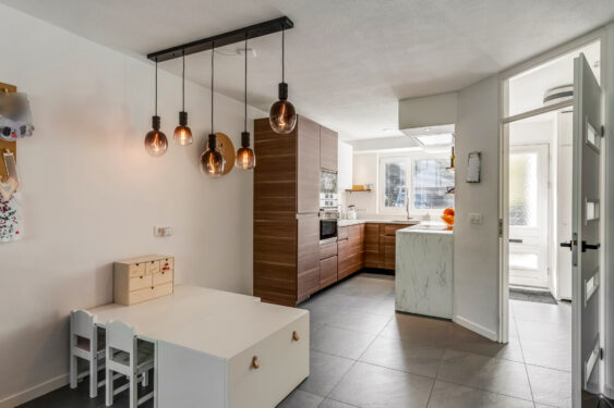 Via de dubbele tuindeuren is de achtertuin direct toegankelijk. Aan de straatzijde bevindt zich de stijlvolle keuken in praktische U-opstelling. Deze is compleet uitgerust met diverse inbouwapparatuur, waaronder een inductiekookplaat, afzuigkap, oven, koelkast, separate vriezer en vaatwasser. De gehele begane grond is voorzien van vloerverwarming en afgewerkt met een plavuizen vloer.