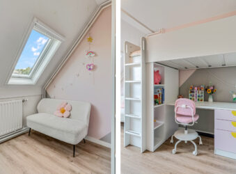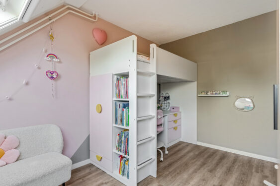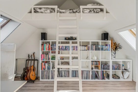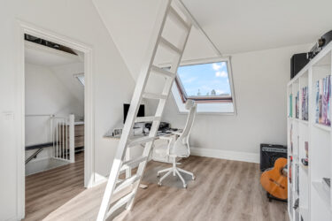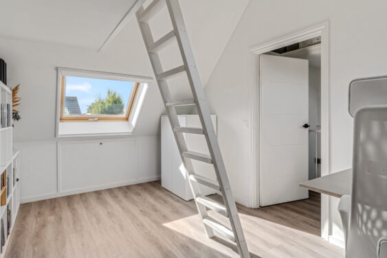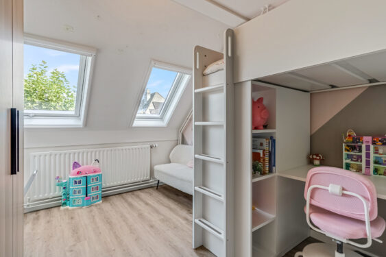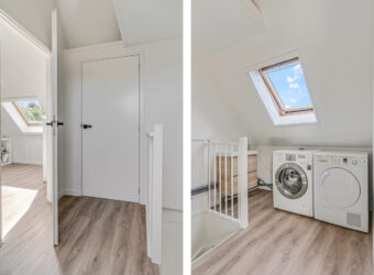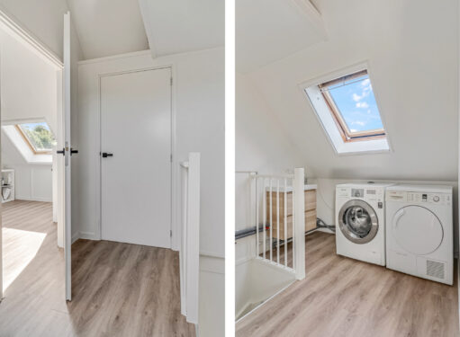 2e verdieping: De voorzolder is ingericht met een praktische hoek voor wasmachine en droger en beschikt over een dakvenster en een praktische bergvide. Vanuit hier is toegang tot een ruime slaapkamer met meerdere dakvensters en een slaapvide. Daarnaast bevindt zich op deze verdieping een berging met de opstelling voor de mechanische ventilatie, de omvormer, de cv-ketel (2023) en warmtepompinstallatie (2022).