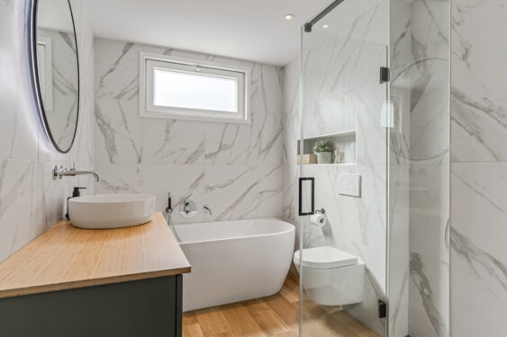 Via de overloop is tevens de moderne badkamer bereikbaar, uitgevoerd met een wastafelmeubel met verlichte spiegel, een vrijstaand ligbad en een ruime stortdouche.