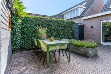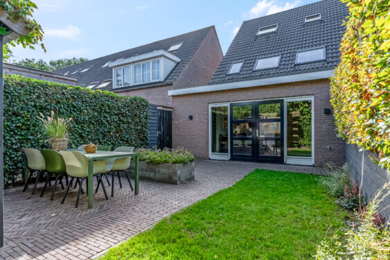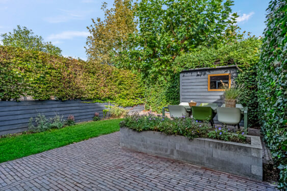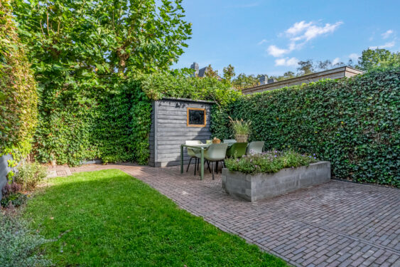 Buiten: Aan de voorzijde bevindt zich een aangebouwde bergruimte en is er parkeergelegenheid voor één auto op eigen terrein. De achtertuin is verzorgd aangelegd met een combinatie van gras en sierbestrating, wat zorgt voor een rustig en verzorgd geheel. Achter in de tuin staat een praktische houten berging. De tuin is bovendien via achterom bereikbaar via een poortdeur in de schutting.