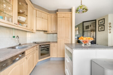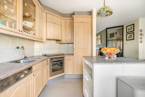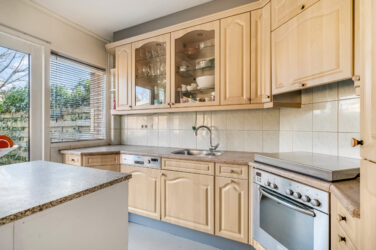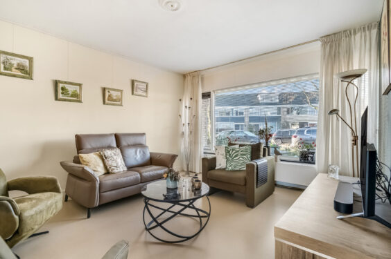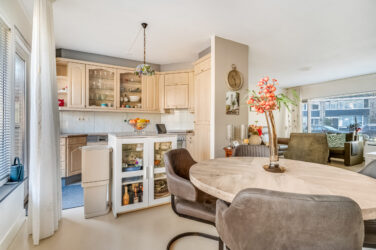 Indeling: ontvangsthal met trapopgang naar de 1e verdieping, garderobe, meterkast en toiletruimte. De Z-vormige woonkamer met fraaie stalen deur brengt je naar een gezellig zitgedeelte aan de straatzijde en eetgedeelte aan de tuinzijde. Aansluitend aan het eetgedeelte is de open keuken gesitueerd die in een hoekopstelling is geplaatst voorzien van een kunststof werkblad, bovenkasten en inbouwapparatuur zoals een 4-pits gaskooktoestel, afzuigkap, oven, koelkast met vriesvak en vaatwasser. Tegenover de keuken is een handig werkeiland geplaatst met marmeren werkblad en extra opbergruimte.