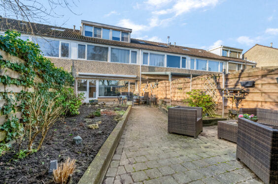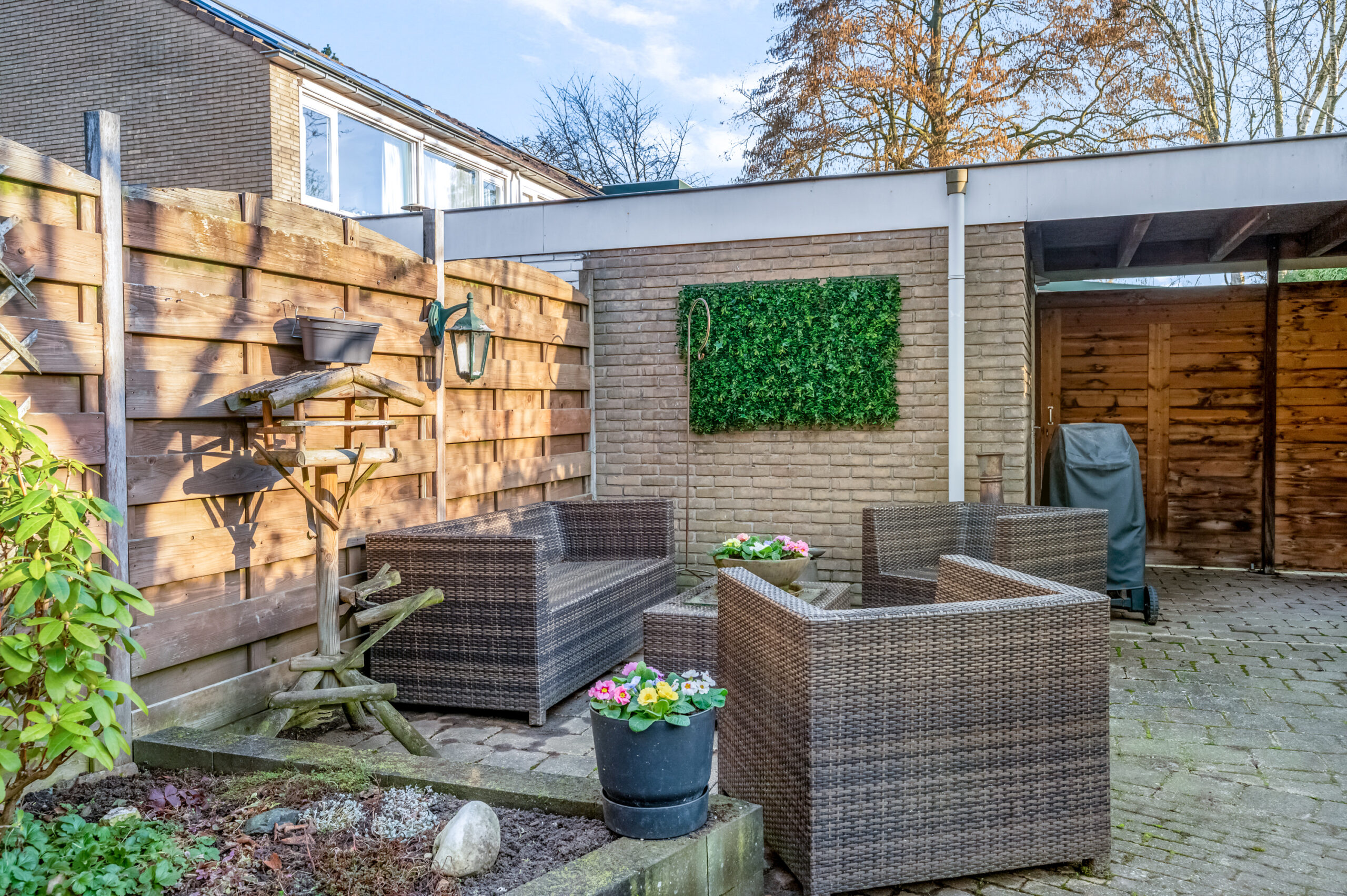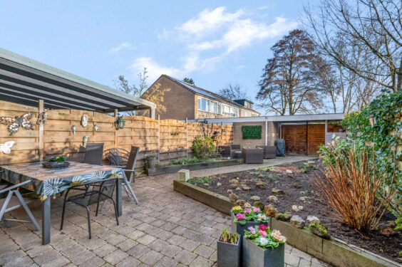 De nette voortuin bestaat uit borderbeplanting en heeft een tegelpad naar de voordeur. De achtertuin is een royale tuin met mooie verzorgde borders en twee heerlijke zonnige terrassen met prettig vrij uitzicht. De tuin geeft toegang tot een stenen berging met overkapping die voorzien is van elektra en achterom bereikbaar is.