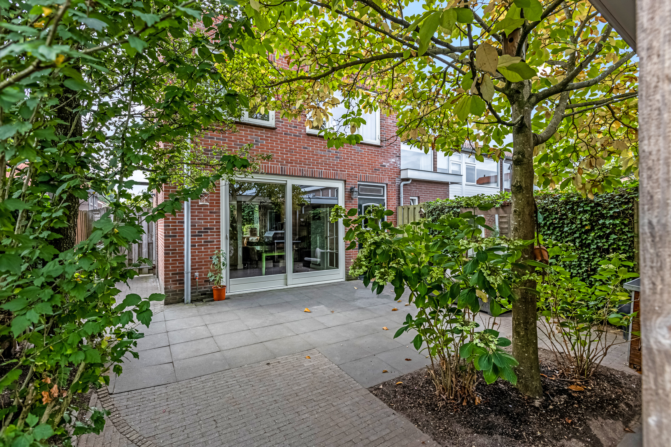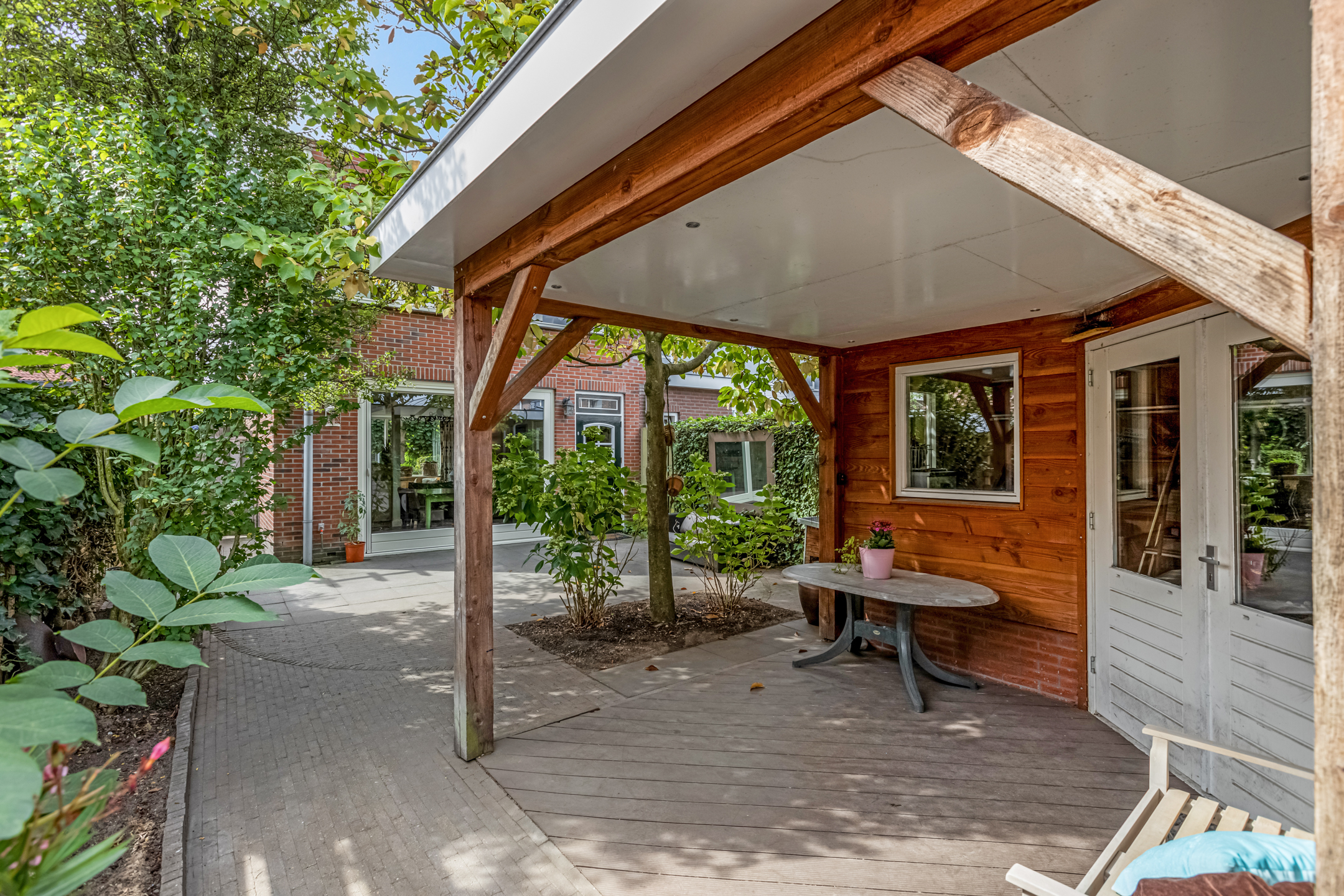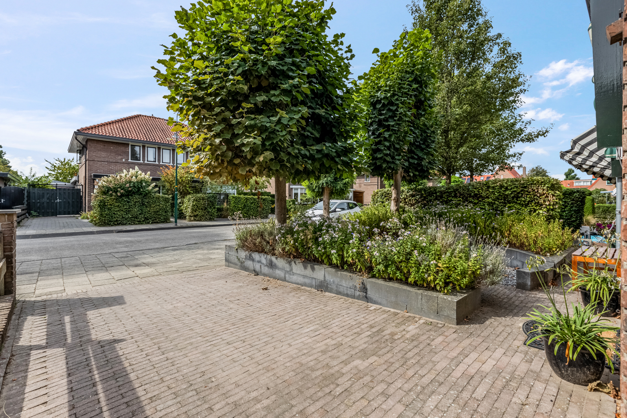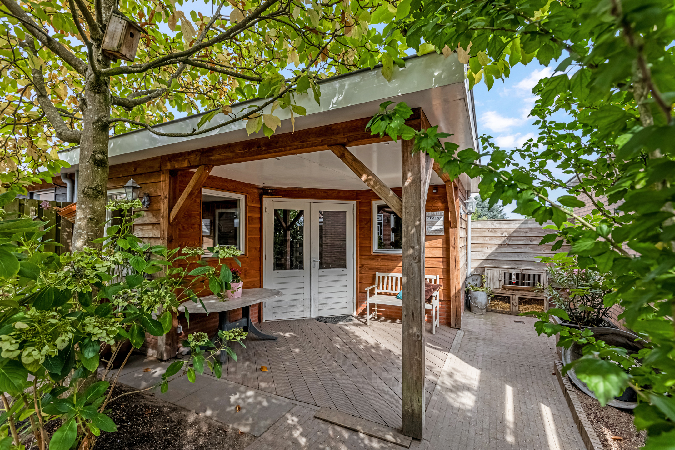 De voortuin bestaat uit mooie borders, leibomen en sierbestrating met grind. Via een tegelpad is via een poort de achtertuin bereikbaar. De achtertuin heeft mooie borders, bomen en sierbestrating. De houten berging met openslaande deuren heeft een gezellige overkapping. Parkeervoorzieningen zijn er op eigen terrein en in de omgeving.