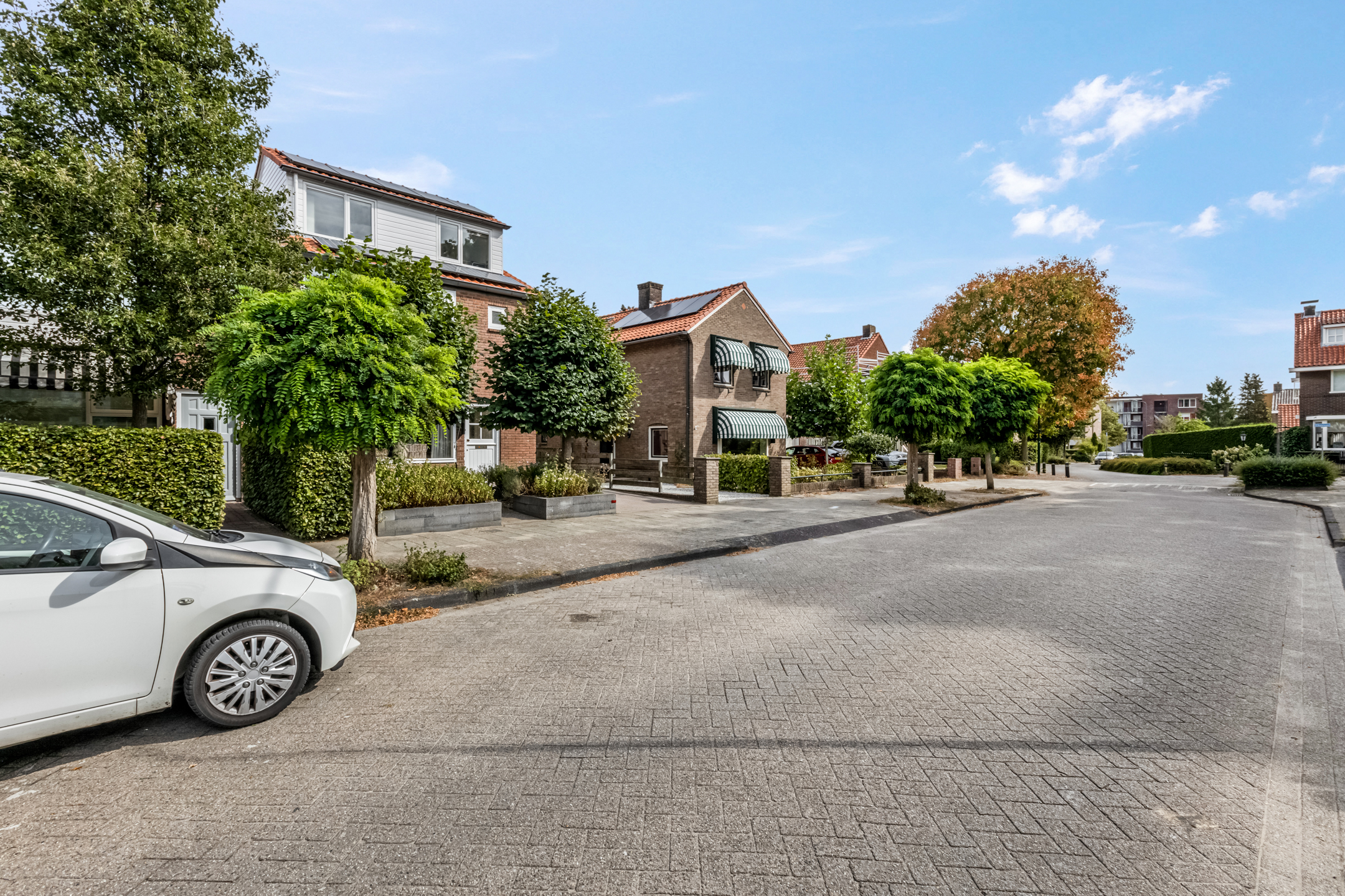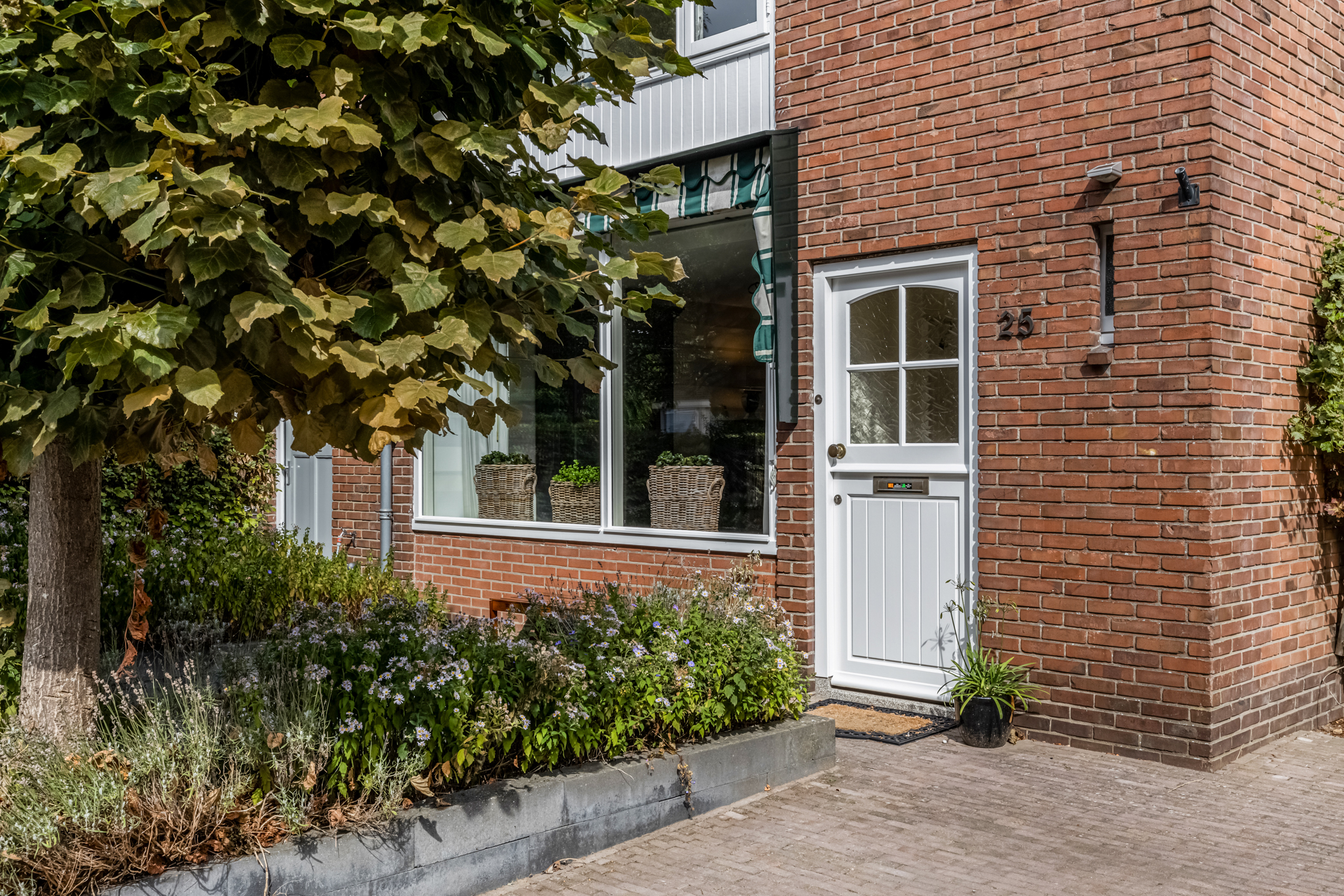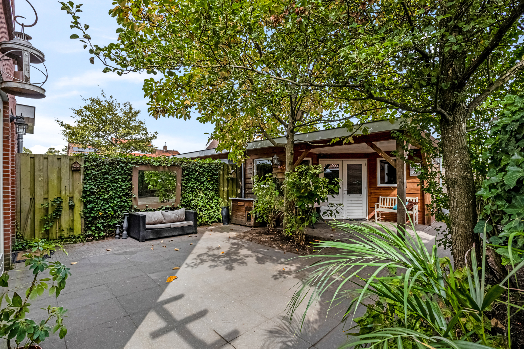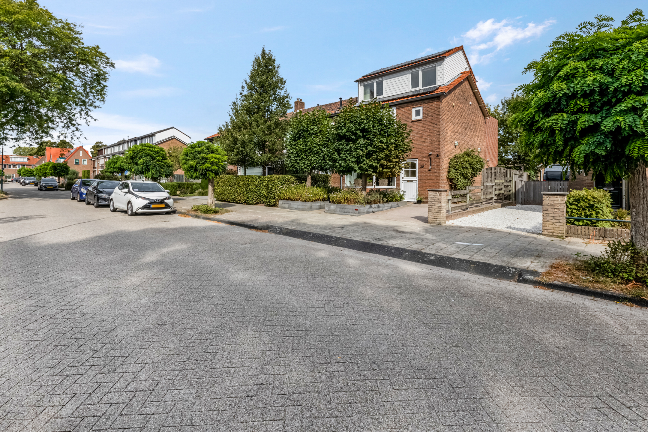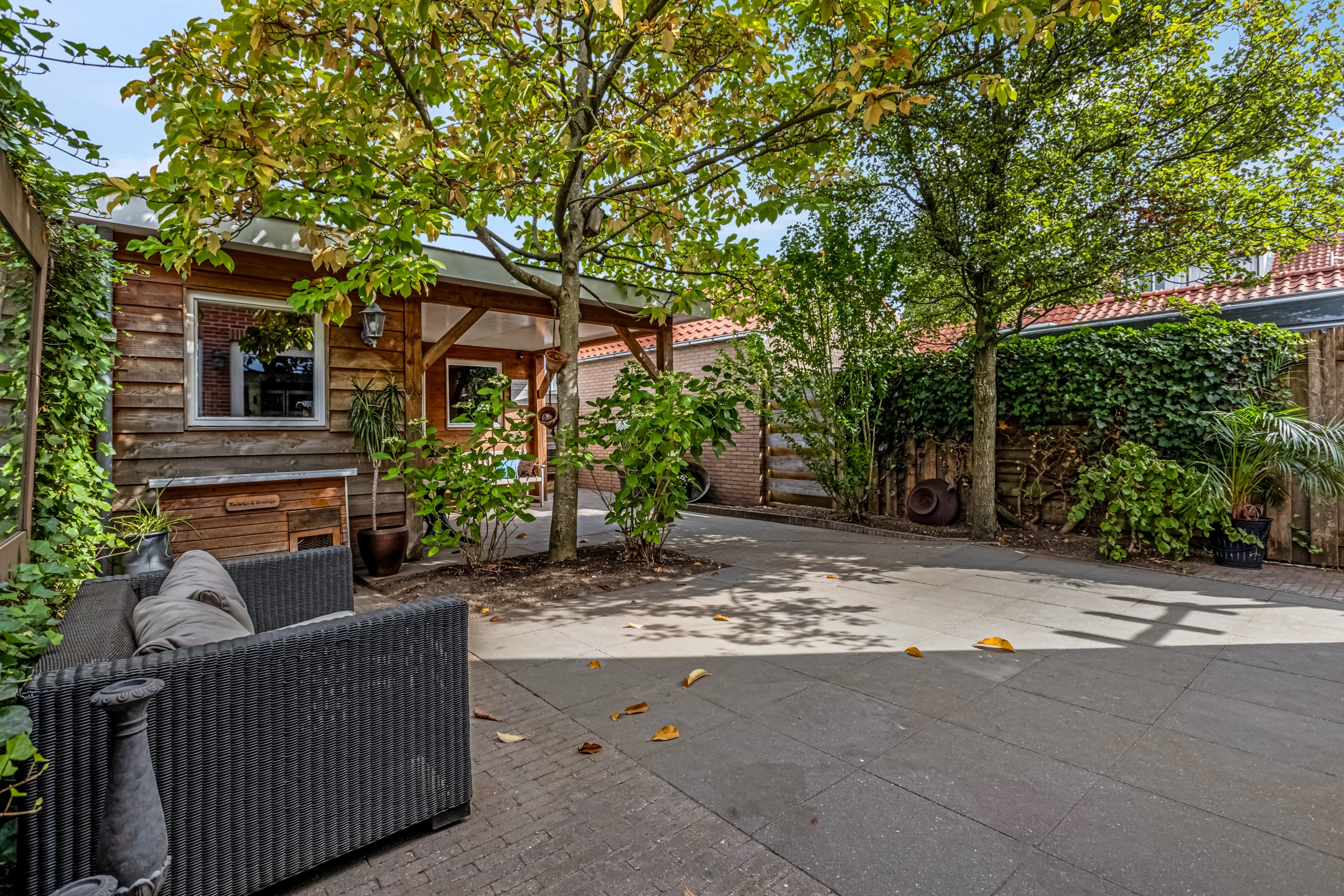 De voortuin bestaat uit mooie borders, leibomen en sierbestrating met grind. Via een tegelpad is via een poort de achtertuin bereikbaar. De achtertuin heeft mooie borders, bomen en sierbestrating. De houten berging met openslaande deuren heeft een gezellige overkapping. Parkeervoorzieningen zijn er op eigen terrein en in de omgeving.
