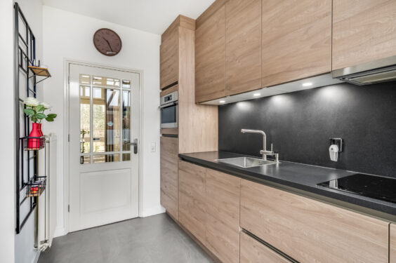 Indeling: ontvangsthal met trapopgang naar de 1e verdieping, toiletruimte, trap/kelderkast en toegang tot de keuken. De open keuken is voorzien van een verzorgde wandopstelling met bovenkasten, royaal werkblad en inbouwapparatuur zoals een 4-pits inductiekookplaat met RVS afzuigkap, combimagnetron, koelkast en vaatwasser. Via de open keuken is er toegang tot de lichte doorzonwoonkamer met mooie (laminaat) tegelvloer en aan de voorzijde een elektrisch bedienbaar rolluik.